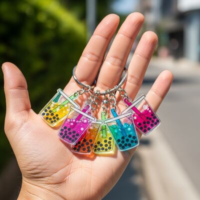 Un llavero acrílico de estilo Glitter lleno de brillo para un acabado deslumbrante y llamativo.